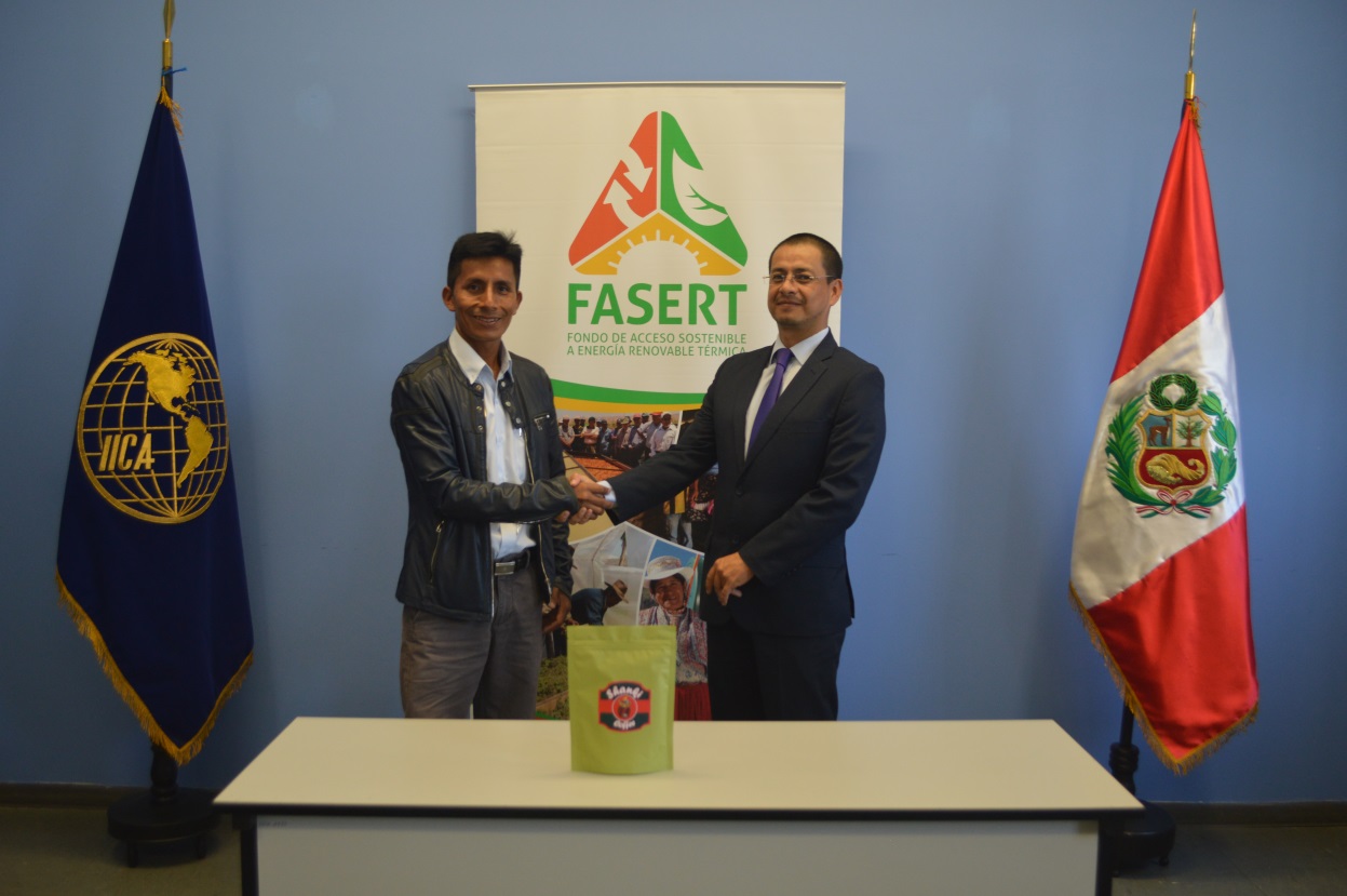 Fidencio Quispe Medina, en nombre de la Cooperativa Agraria Cafetalera Shankivironi junto a Javier García, representante del IICA Perú firman el convenio para dar inicio al fondo de crédito para la Implementación de cocinas ecoeficientes en hogares rurales en las zonas de influencia del bosque-modelo Pichanaki y del VRAEM.